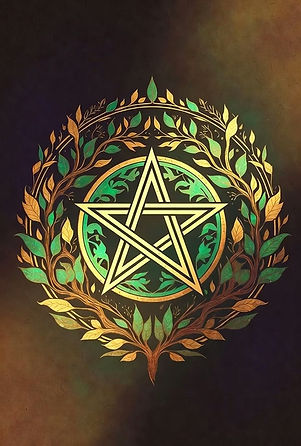 The wooden wreath pentacle was carefully crafted by one of the founders. Oak wood to represent continual and enduring growth, ivy vines to represent overcoming obstacles, the foliage within the gold ring represents growth and learning, and the pentacle to represent overcoming the elements of life while embodying nature.